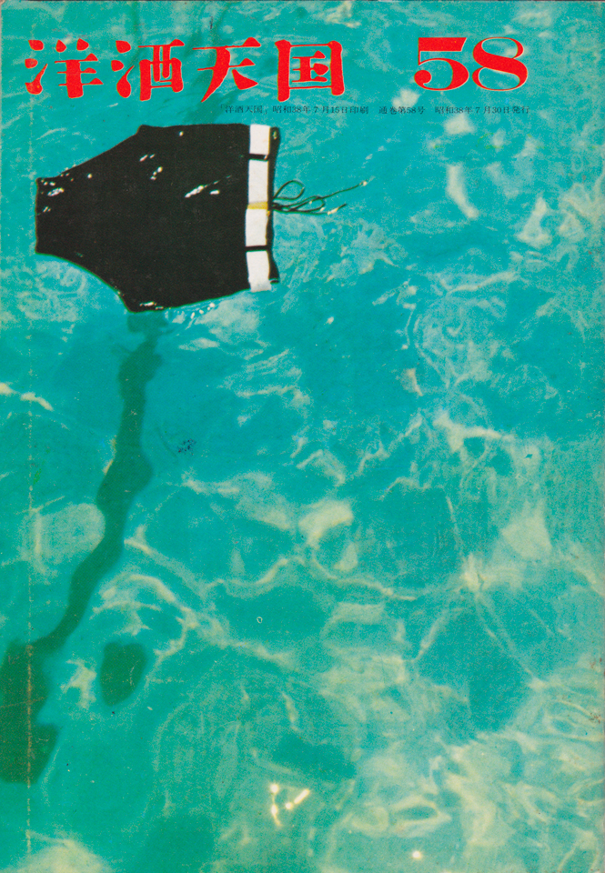 壽屋(現サントリーホールディングス)PR誌『洋酒天国』(洋酒天国社)第58号は、昭和38年7月発行。おそらく海の水面であろう其処に、黒色の海苔? ではない水着が、ぽつりと浮かんでいる。実は裏表紙も同じ水面で、其処には女性用の黄色い水着と、トリス(エクストラ)の瓶がぷかぷかと浮いているのだった。この表紙の“水面の写真”は、薄久夫氏の作である。サントリーの宣伝部における広告写真の仕事で知られた名カメラマンである。