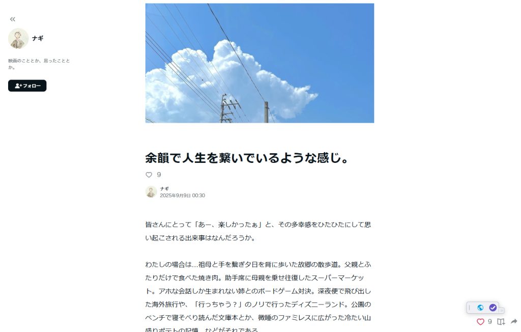 ところで、“余韻で人生を繋いでいる”とnoteに表明したのは、ひろひろ(ナギ)さんだ。