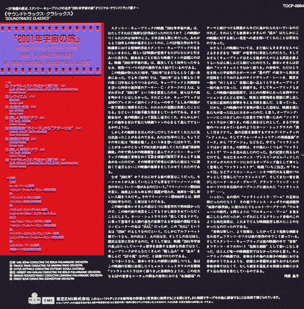それを買った当時はもちろん、もうあれから35年近く経過しているので、このCDを所有したまま近年聴く機会はほとんどなく、全く気づかなかったのだけれど、本篇の映画のメインテーマでもあるリヒャルト・シュトラウス(Richard Strauss)の交響詩「ツァラトゥストラはかく語りき」(“Also sprach Zarathustra”)の演奏者が、本篇で採用されていないカール・ベーム(Karl Böhm)指揮ベルリン・フィルハーモニー管弦楽団によるものが収録されており、いうなれば実質的なオリジナル・サウンドトラック盤ではないのだった。