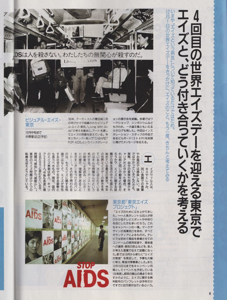 この号の最初のトピックは、4回目を迎える都内のイベント。東京・中野駅周辺で催された「ビジュアル・エイズ・東京」、東京都主催の“STOP AIDS”「東京エイズプロジェクト」、町田市立国際版画美術館での「ビデオ・オン・エイズ―ビデオ・アゲインスト・エイズ」展が紹介されていた。