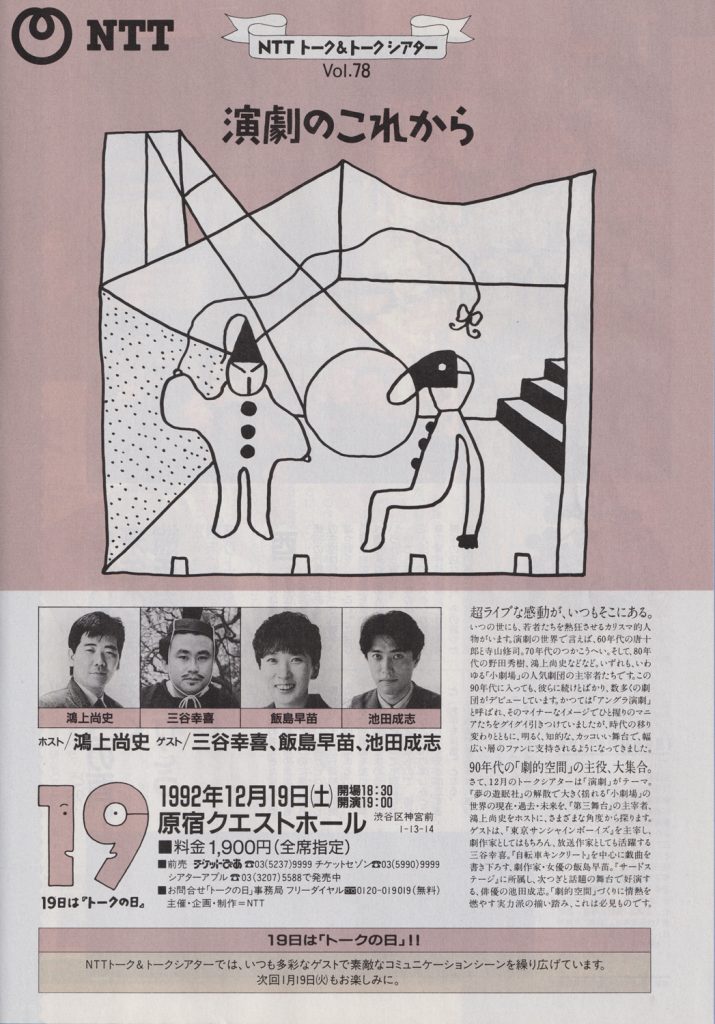 この広告ページによると、12月は「演劇」がテーマで、夢の遊眠社の解散で揺れ動く“小劇場”界隈の現在・過去・未来を探るという企画。第三舞台(サードステージ)の主宰者・鴻上尚史さんをホストに、東京サンシャインボーイズの三谷幸喜さん、自転車キンクリートの劇作家・飯島早苗さん、サードステージの俳優・池田成志さんらゲストを招いて「演劇」を語る――。