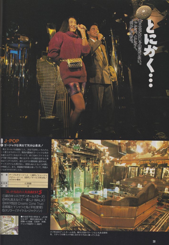 それぞれのスポットには、“コレが当店の人気曲BEST3”が記してあって、久保田利伸さんの「Missing」、サザンオールスターズの「涙のキッス」、J-WALKの「何も言えなくて…夏」など、当時の人気曲が見受けられるが、一部のスポットでは、「科学忍者隊ガッチャマン」、「新造人間キャシャーン」、「ど根性ガエル」といった時代錯誤なアニソンも混じっていて、なんだこれは???…と思う。