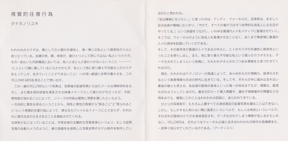 CD-ROM『Yellows MEN Tokyo 1994 AKIRA GOMI Photographs』タナカノリユキ著「視覚的往復行為」より引用