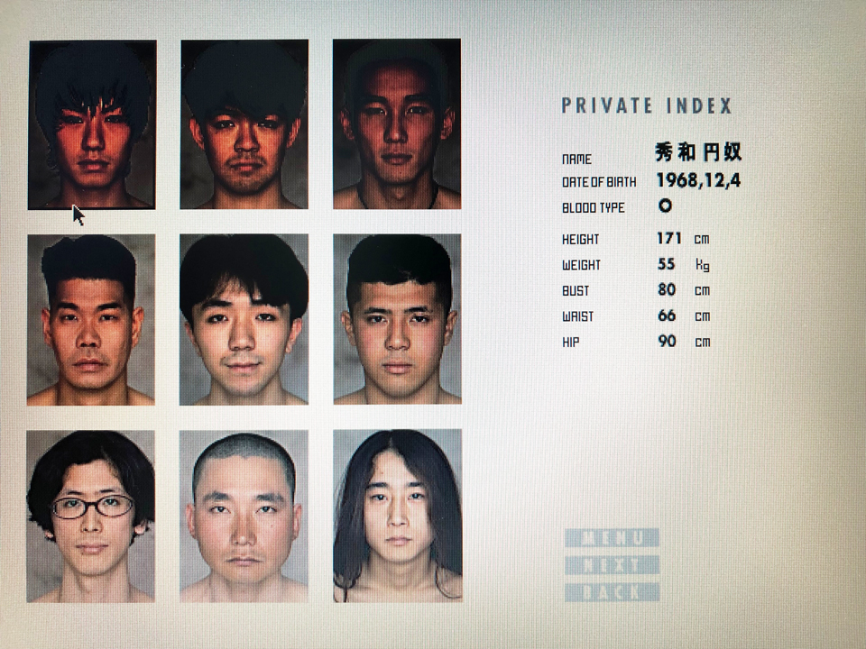 五味氏はただここに写真を並べて、その構図やらセンスやら身体美を見せようとしたのではなく、多数のヒトのカラダを標本化し、見る側の欲望=「暴きたい欲望」を掻き立てる、言わば“覗きの主犯者”に、その好きな個人の写真を「選ぶ見る」自由と選択権を与えた仕組みを、コンピューター上に構築したわけである。それがCD-ROMのインタラクティヴな世界の中で、一つの作品として成立しているのだった。