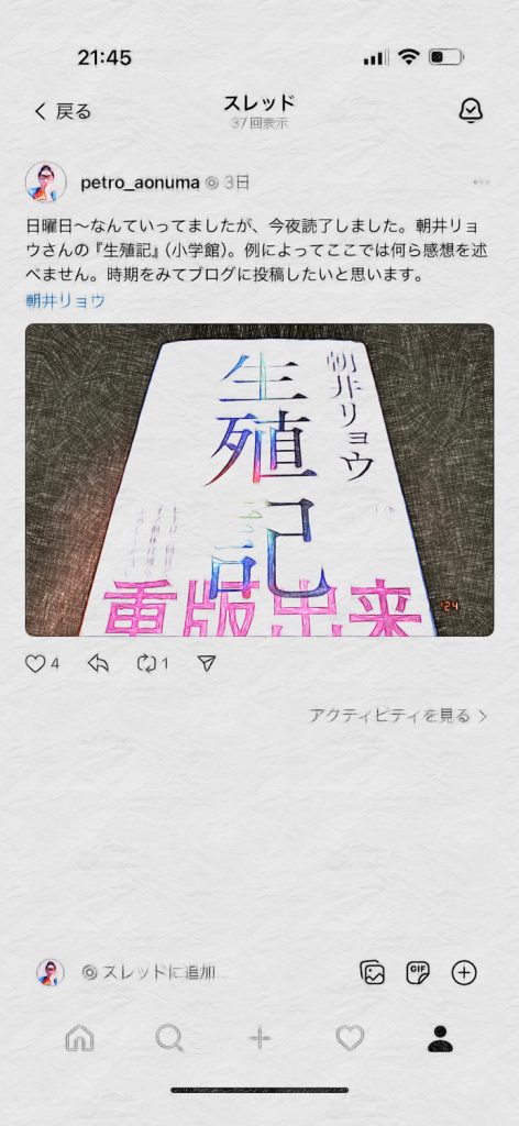 前段となる「私は朝井リョウの『生殖記』を読み始めるというのか」を書き上げたその日、偶然ながら、人生を共にできると信じていた“最愛の人”が、異国へ帰るために会社を退く――という突然の出来事で面食らう。これは小説の話ではない。私の私生活における出来事である。この数日後、『生殖記』を読了する。