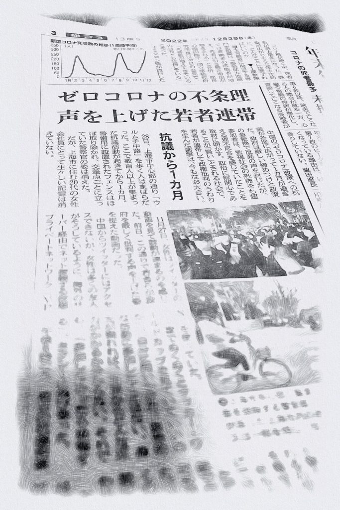 民主主義から程遠い国、中国の大都市で、若者が声を上げた抗議デモが、昨今報道されて已まない。上海で起きた抗議デモである(2022年12月29日付朝日新聞朝刊の記事「ゼロコロナの不条理 声を上げた若者連帯」)。