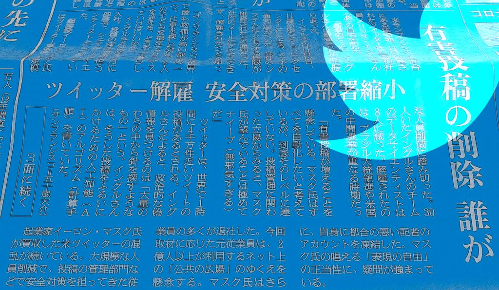 さらに同日付の朝日新聞朝刊では、「削る人員 減る広告」という見出しで、マスク氏の改革路線を非難している。記事内の図では、ロイターが報じた改革の影響についての要点3つを引用。その結果、ツイッターでは「有害投稿」が増加し、主要な広告主がツイッターへの広告表示を止めたことを強調している。